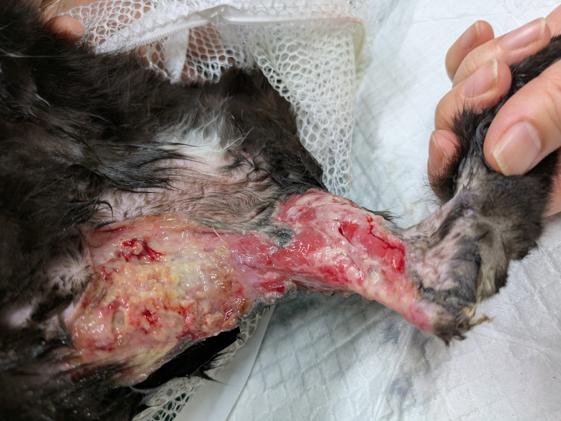 この症例は猫ちゃんがケンカで咬まれた際に広範囲に化膿し皮膚が壊死脱落した時の写真です。後肢の大部分の皮膚が欠損(左後肢の全周約7割)しており、皮膚移植手術(有茎皮弁移植術)では複数回必要になる可能性があるため飼主様と相談し、再生医療(幹細胞培養上清液)を用いた治療を行いました。